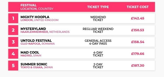 Pentru realizare acestui studiu, compania Slingo a colectat date pentru următorii factori: costul unui bilet, durata festivalului, capacitatea zilnică a festivalului, numărul de scene, numărul de artiști. Festivalurile fără date complete pentru toți factorii au fost eliminate.