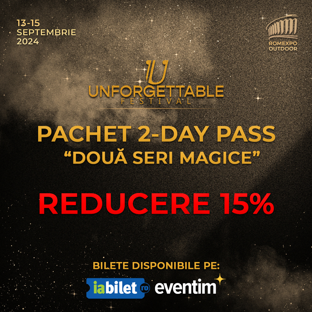 Unforgettable Festival este mai mult decât un simplu eveniment muzical; este o sărbătoare a culturii, gusturilor și experiențelor diverse. Nu rata ocazia de a trăi magia muzicii și de a descoperi simfonia gusturilor la Unforgettable Festival, între 13 și 15 septembrie, la Romexpo. Accesul se face pe baza unui bilet cumpărat în prealabil, iar opțiunile de abonamente pentru cele trei zile sau bilete de o zi pot fi achiziționate de pe www.iabilet.ro sau www.eventim.ro. În plus, până pe data de 13 septembrie, beneficiați de o serie de pachete promoționale: