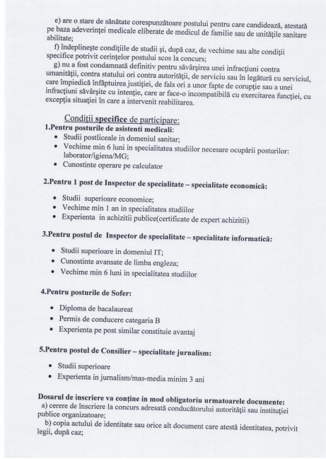 - Vechime min 6 luni în specialitatea studiilor necesare ocupării posturilor: laborator/igiena/MG;