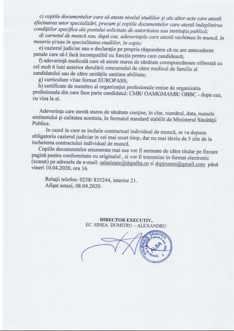 Direcția de Sănătate Publică Alba angajează personal medical, fără concurs, pe o perioadă determinată de maximum 6 luni, pentru a suplimenta necesităţile actuale ale instituției.