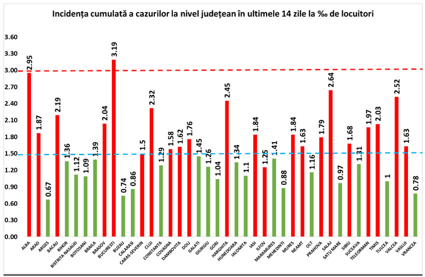 Coeficientul infectărilor cumulate la 14 zile, raportate la 1.000 de locuitori, calculat de către Direcțiile de Sănătate Publică, la nivelul Municipiului București și al județelor este următorul: