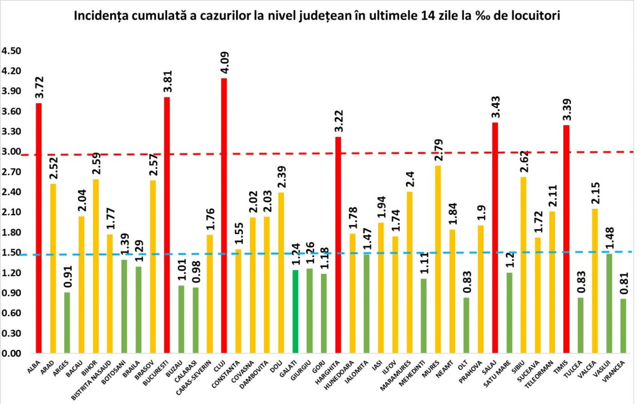 Coeficientul infectărilor cumulate la 14 zile, raportate la 1.000 de locuitori, calculat de către Direcțiile de Sănătate Publică, la nivelul Municipiului București și al județelor este următorul:
