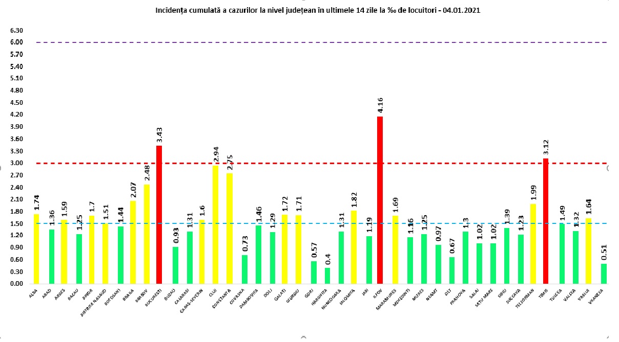 Coeficientul infectărilor cumulate la 14 zile, raportate la 1.000 de locuitori este calculat de către Direcțiile de Sănătate Publică, la nivelul Municipiului București și al județelor. Mai jos aveți graficul realizat în baza raportărilor primite de CNCCI de la Direcțiile de Sănătate Publică:
