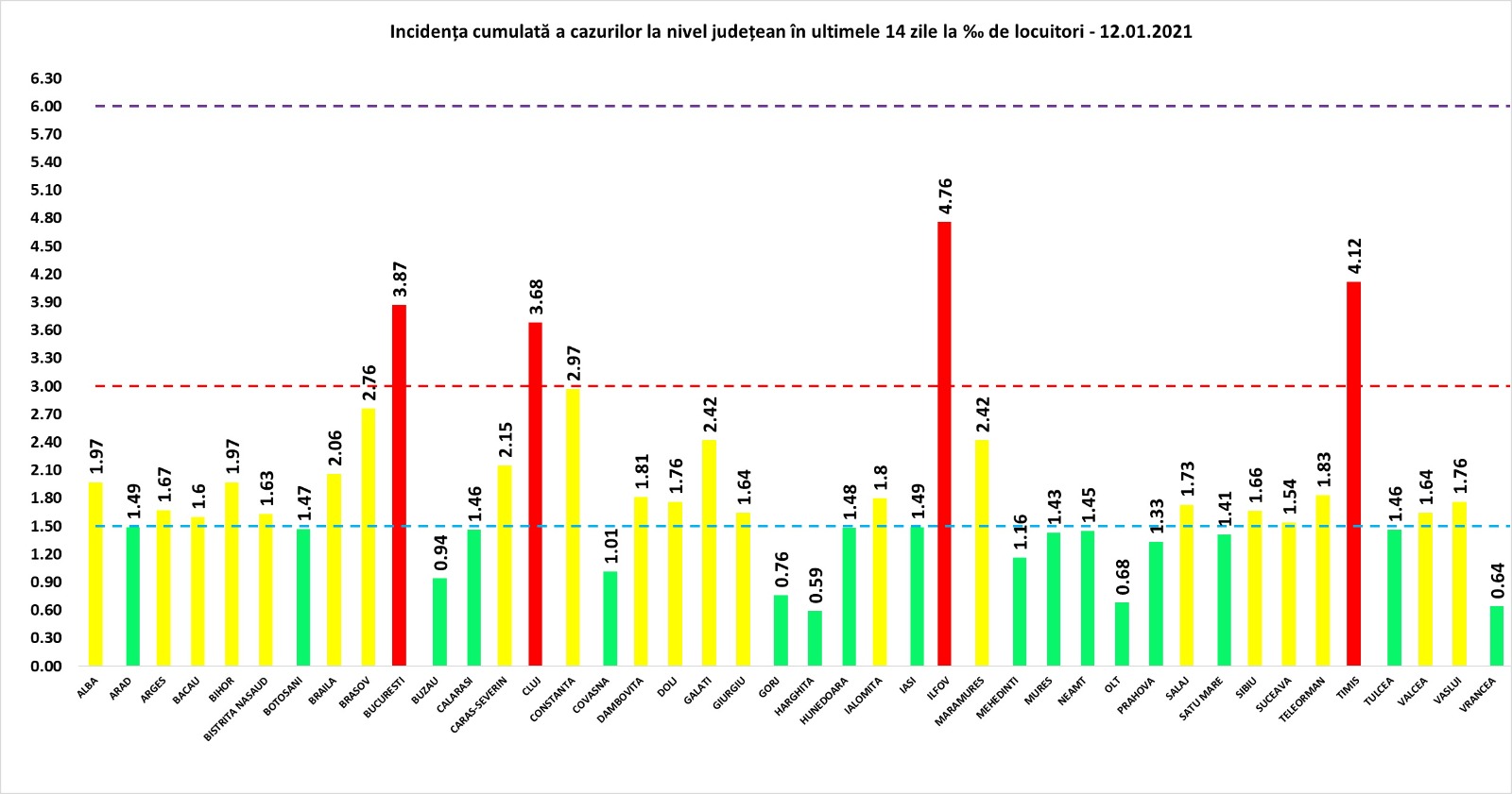 Coeficientul infectărilor cumulate la 14 zile, raportate la 1.000 de locuitori este calculat de către Direcțiile de Sănătate Publică, la nivelul Municipiului București și al județelor. Mai jos aveți graficul realizat în baza raportărilor primite de CNCCI de la Direcțiile de Sănătate Publică:
