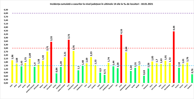 Coeficientul infectărilor cumulate la 14 zile, raportate la 1.000 de locuitori este calculat de către Direcțiile de Sănătate Publică, la nivelul Municipiului București și al județelor. Mai jos aveți graficul realizat în baza raportărilor primite de CNCCI de la Direcțiile de Sănătate Publică: