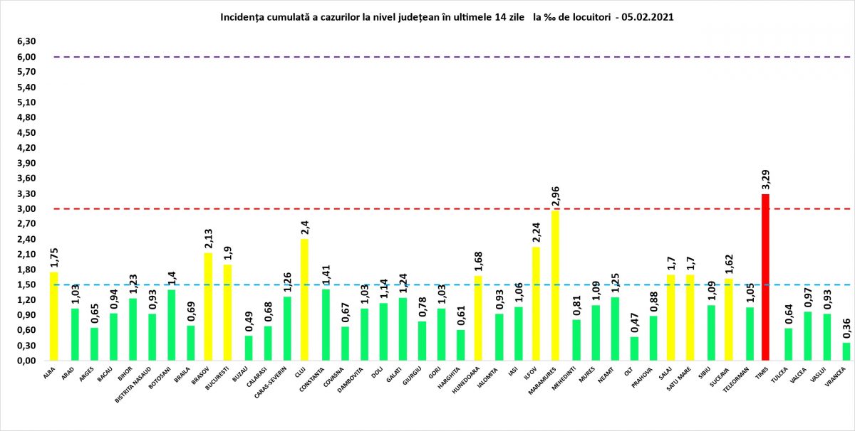 În urma testelor efectuate la nivel național, față de ultima raportare, au fost înregistrate 2.580 cazuri noi de persoane infectate cu Covid-19. Până astăzi, 5 februarie, pe teritoriul României, au fost confirmate 740.732 de cazuri de persoane infectate cu noul coronavirus (COVID – 19). 686.692 de pacienți au fost declarați vindecați.
