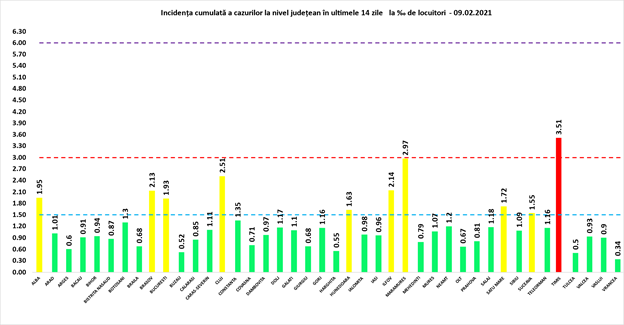 Coeficientul infectărilor cumulate la 14 zile, raportate la 1.000 de locuitori este calculat de către Direcțiile de Sănătate Publică, la nivelul Municipiului București și al județelor. Mai jos aveți graficul realizat în baza raportărilor primite de CNCCI de la Direcțiile de Sănătate Publică: