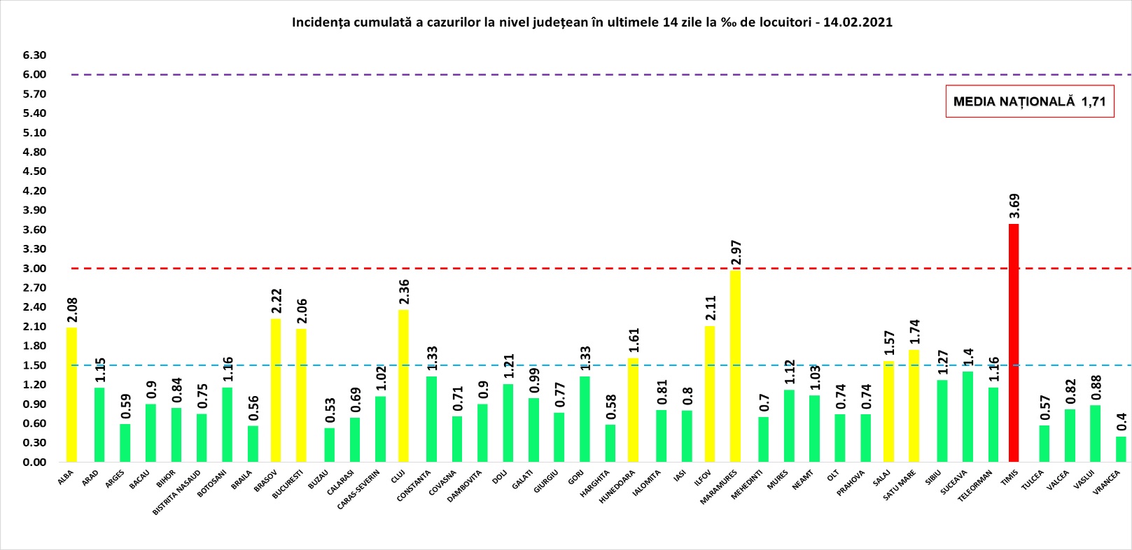 Coeficientul infectărilor cumulate la 14 zile, raportate la 1.000 de locuitori este calculat de către Direcțiile de Sănătate Publică, la nivelul Municipiului București și al județelor. Mai jos aveți graficul realizat în baza raportărilor primite de CNCCI de la Direcțiile de Sănătate Publică: