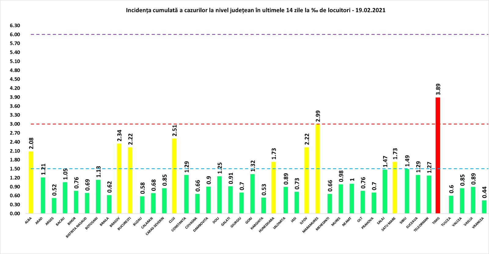 Coeficientul infectărilor cumulate la 14 zile, raportate la 1.000 de locuitori este calculat de către Direcțiile de Sănătate Publică, la nivelul Municipiului București și al județelor. Mai jos aveți graficul realizat în baza raportărilor primite de CNCCI de la Direcțiile de Sănătate Publică: