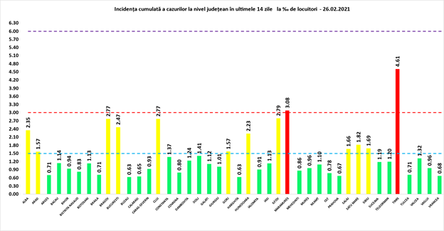 În urma testelor efectuate la nivel național, față de ultima raportare, au fost înregistrate 3.761 cazuri noi de persoane infectate cu Covid-19. Până astăzi, 26 februarie, pe teritoriul României, au fost confirmate 795.732 de cazuri de persoane infectate cu noul coronavirus (COVID – 19). 736.020 de pacienți au fost declarați vindecați.
