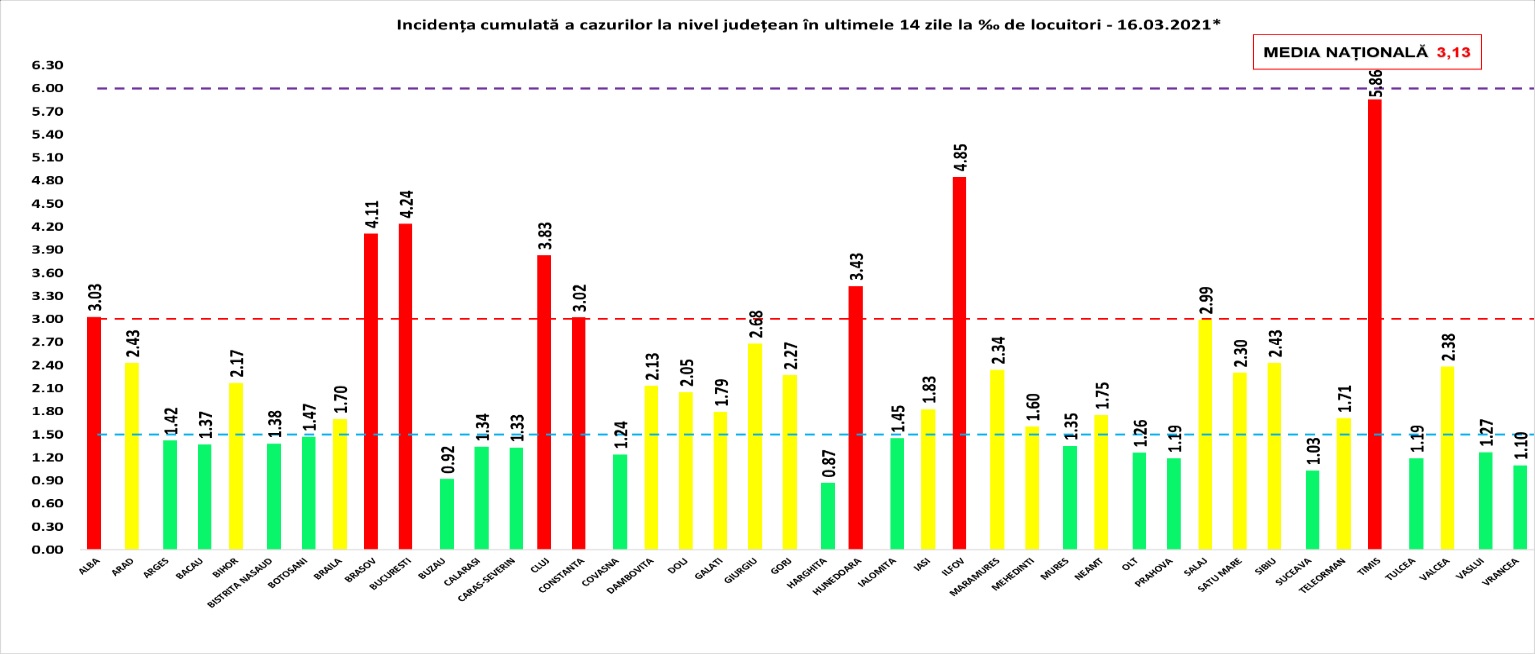 Coeficientul infectărilor cumulate la 14 zile, raportate la 1.000 de locuitori este calculat de către Direcțiile de Sănătate Publică, la nivelul Municipiului București și al județelor. Mai jos aveți graficul realizat în baza raportărilor primite de CNCCI de la Direcțiile de Sănătate Publică: