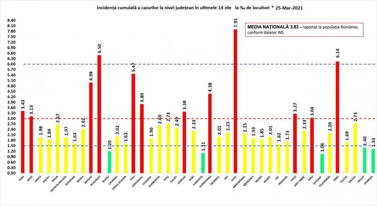 Coeficientul infectărilor cumulate la 14 zile, raportate la 1.000 de locuitori este calculat de către Direcțiile de Sănătate Publică, la nivelul Municipiului București și al județelor. Mai jos aveți graficul realizat în baza raportărilor primite de CNCCI de la Direcțiile de Sănătate Publică: