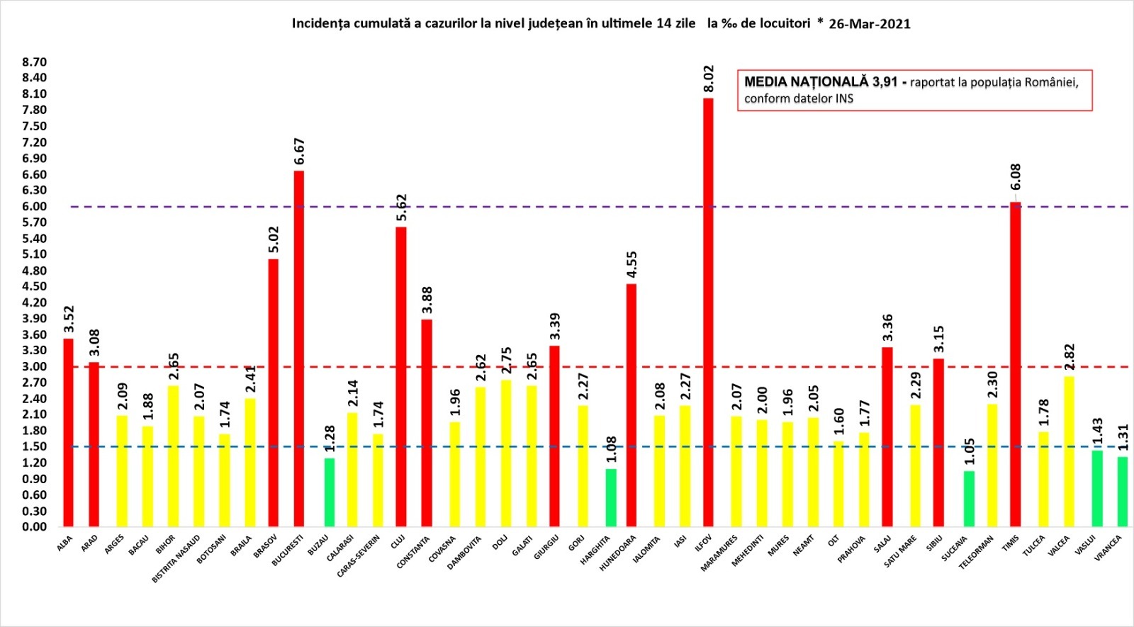 În intervalul 25.03.2021 (10:00) – 26.03.2021 (10:00) au fost raportate 116 decese (59 bărbați și 57 femei), ale unor pacienți infectați cu noul coronavirus, internați în spitalele din Alba, Argeș, Arad, Municipiul București, Bacău, Bihor, Bistrița-Năsăud, Brăila, Botoșani, Brașov, Buzău, Cluj, Caraș-Severin, Constanța, Covasna, Dâmbovița, Dolj, Gorj, Hunedoara, Harghita, Ilfov, Ialomița, Mehedinți, Olt, Prahova, Sibiu, Sălaj, Satu Mare, Suceava, Teleorman, Tulcea, Timiș, Vaslui, Vrancea.