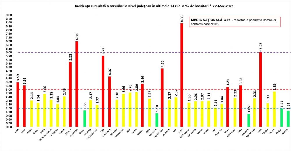Coeficientul infectărilor cumulate la 14 zile, raportate la 1.000 de locuitori este calculat de către Direcțiile de Sănătate Publică, la nivelul Municipiului București și al județelor. Mai jos aveți graficul realizat în baza raportărilor primite de CNCCI de la Direcțiile de Sănătate Publică: