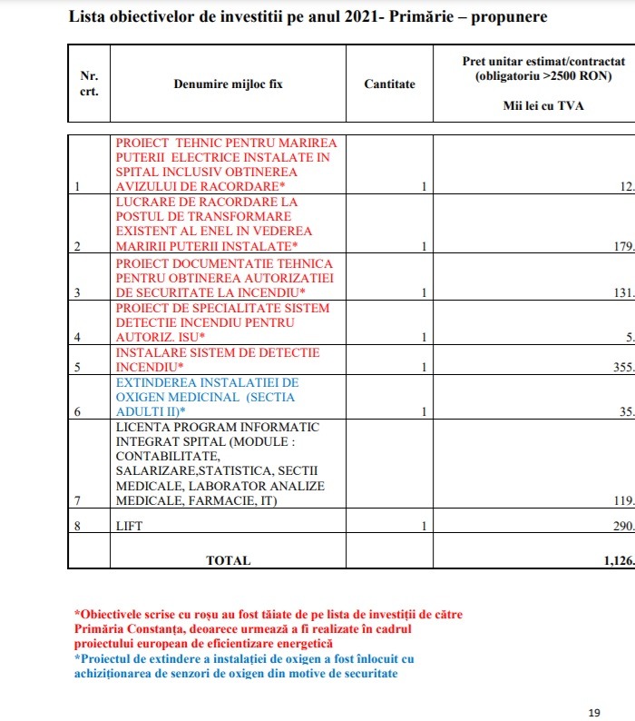 Planul Strategic al Spitalului de Boli Infecțioase Constanța arată că instituția sanitară avea nevoie de investiții mari la instalația electrică. Acestea au fost amânate de Primăria Constanța, în subordinea căreia se află spitalul, pentru a fi acoperite financiar de banii dintr-un proiect european. Edilul orașului de la malul mării este Vergil Chițac, membru PNL.