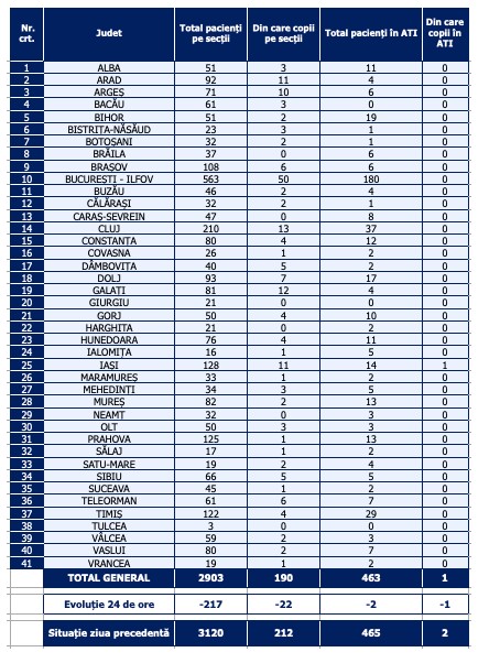 Dintre cei 463 de pacienți internați la ATI, 411 sunt nevaccinați. Din totalul pacienților internați, 191 sunt minori, 190 fiind internați în secții, cu 22 mai puțin decât în ziua anterioară și 1 la ATI, cu 1 mai puțin decât în ziua anterioară.