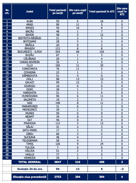 De asemenea, la ATI sunt internate 400 persoane, cu 6 mai mult decât în ziua anterioară. Dintre cei 400 pacienți internați la ATI, 349 sunt nevaccinați. Din totalul pacienților internați, 218 sunt minori, 216 fiind internați în secții, cu 12 mai mult decât în ziua anterioară și 2 la ATI, cu 2 mai puțin decat în ziua anterioară.