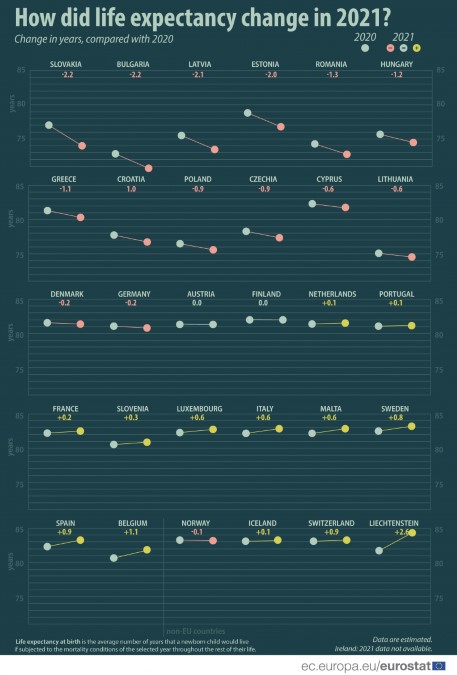 Cele mai grave scăderi ale speranţei de viaţă au fost raportate pentru Slovacia şi Bulgaria, cu scăderi de -2,2 ani, urmate de Letonia cu -2,1 ani şi Estonia cu -2,0 ani, comparativ cu 2020.