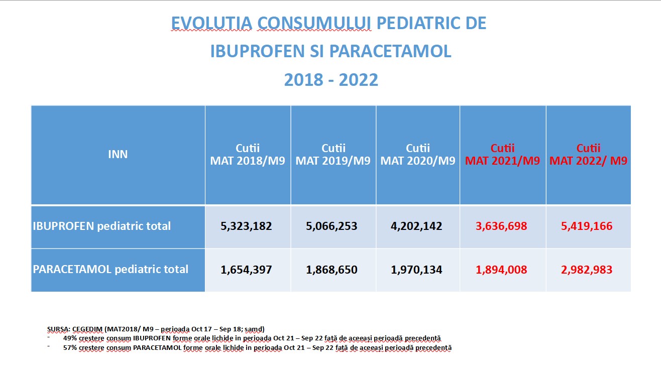 - In urmatoarele luni vor fi livrate lunar circa 200 de mii de flacoane pediatrice de ibuprofen si paracetamol pe luna, atat fabricate in Romania cat si de la export, asadar problema isi va gasi rezolvare la inceputul anului 2023.