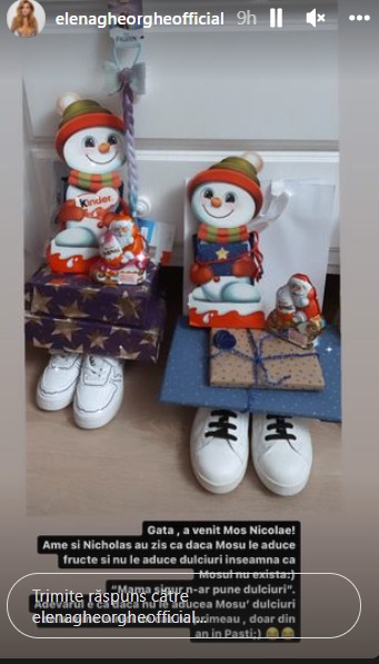 ''Gata, a venit Moș Nicolae! Ame și Nicolas au zis că dacă Moșu le aduce fructe și nu le aduce dulciuri înseamnă că Moșul nu există. ''Mama sigur n-ar pune dulciuri''. Adevărul e că dacă nu le aducea Moșu' dulciuri, de la mine în niciun caz nu primeau, doar din an în Paști. Nicholas și Nicole, vă ador!'', a scris Elena Gheorghe, pe social media.