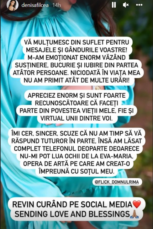 La câteva zile după ce a născut, Denisa Filcea și-a făcut și ea apariția în mediul online și a ținut, în primul și în primul rând să le mulțumească tuturor pentru gândurile și mesaje pe care le-a primit din partea lor zilele acestea. În plus, soția lui Flick a recunoscut că s-a emoționat extrem de tare citindu-le și realizând de cât de multă susținere are parte. A fost pentru prima dată în viața sa când a primit atât de multe urări din partea oamenilor și nu poate decât să fie recunoscătoare pentru tot ceea ce i se întâmplă.