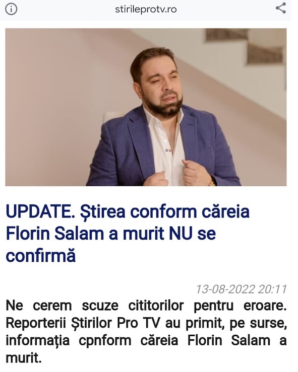Ulterior, pe site-ul știrileprotv.ro, aproape de ora 21:30, au apărut următoarele mențiuni: „Ne cerem scuze cititorilor pentru eroare. Reporterii Știrilor Pro TV au primit, pe surse, informația conform căreia Florin Salam a murit. Din păcare, stirileprotv.ro a eșuat în a verifica informația și din alte surse, fapt care a condus la o regretabilă greșeală”.