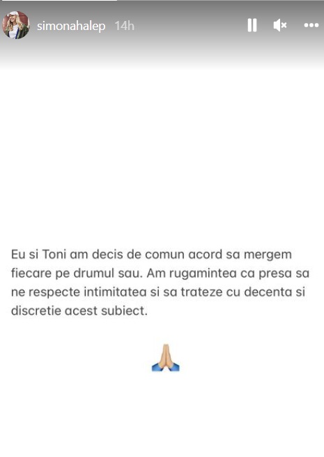 „Eu şi Toni am decis de comun acord să mergem fiecare pe drumul său. Am rugămintea ca presa să ne respecte intimitatea şi să trateze cu decenţă şi discreţie acest subiect”, a scris Simona Halep, pe Instagram.