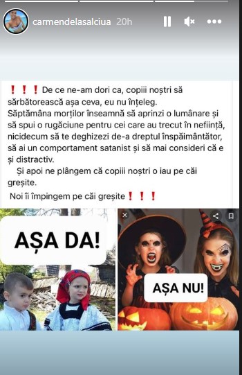 Carmen de la Sălciua este o femeie credincioasă și, așa cum era de așteptat, nici ea nu este de acord cu sărbătorirea Halloween-ului de către români. Într-o postare pe care a făcut-o la Story, artista crede că oamenii nu ar trebui să își dorească, sub nicio formă, ca niște copii să sărbătorească așa ceva. Din punctul ei de vedere, în săptămâna morților oamenii ar trebui să aprindă o lumânare pentru cei care au plecat dintre noi, nu să se deghizeze în totul felul de personaje ciudate, doar pentru a atrage atenția asupra lor. Cel mai rău i se pare că oamenii consideră aceste lucruri sunt amuzante. La final, a scris că din această cauză copiii o iau pe căi greșite, iar părinții lor nu ar trebui să se mire.