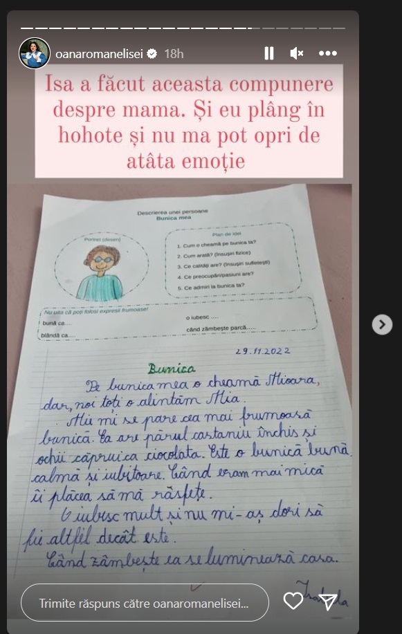 Mai apoi, partenera de viață a lui Marius Elisei a citit compunerea pe care fiica sa, Isa, a făcut-o despre bunica sa și a izbucnit în lacrimi imediat. Vedeta s-a emoționat extrem de tare și nu s-a putut abține să nu le arate și fanilor ei de pe Instagram cât de frumos a vorbit micuța despre Miora Roman a cărei stare de sănătate nu este una foarte bună, în ultimele luni.