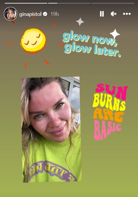 „Ce să zic, chiar am uitat să mă dau cu protecție pe față. Am uns, în schimb, toată familia. Pe corp m-am dat, pe față… după cum se vede”, a scris Gina Pistol, la Story.