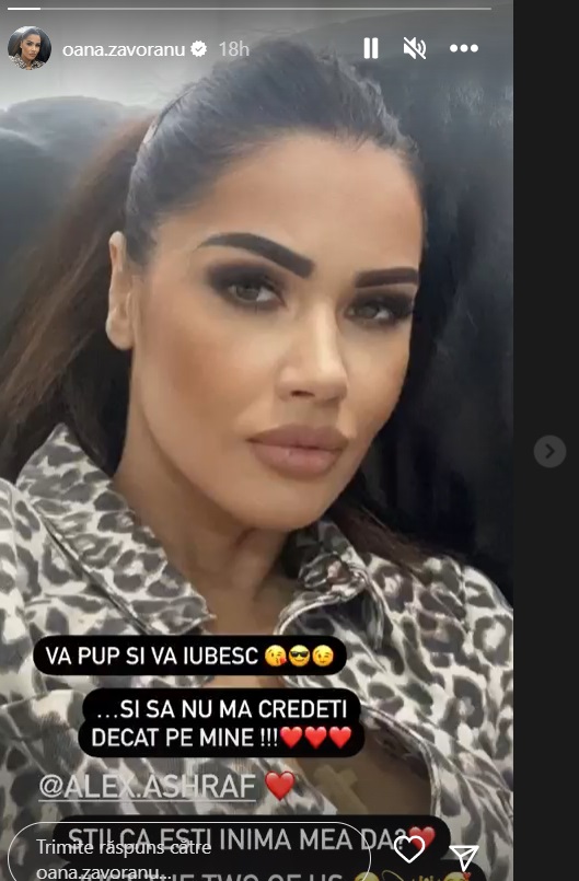 „Vă pup și vă iubesc... Și să nu mă credeți decât pe mine!!! Alex Ashraf știi că ești inima mea, da? Doar noi doi.”, a transmis Oana Zăvoranu, la Story.