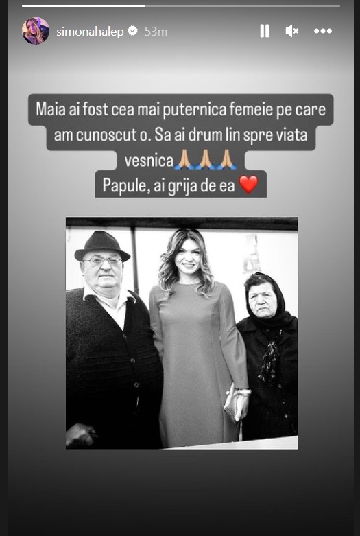 „Maia, ai fost cea mai puternică femeie pe care am cunoscut-o. Să ai drum lin spre viață veșnică! Papule, ai grijă de ea!”, a transmis Simona Halep, la Story.