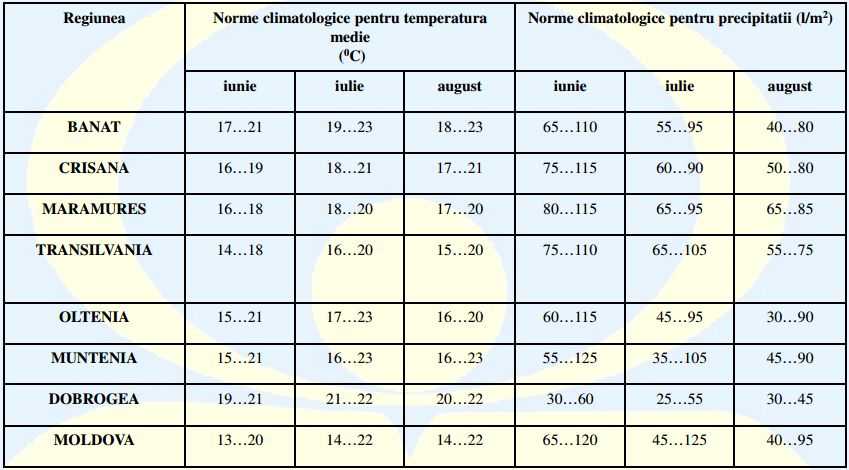 Temperatura aerului va avea in general valori peste normele climatologice in cea mai mare parte a regiunilor, iar in centrul si nordul tarii valorile termice pot fi normale. Cantitatile lunare de precipitatii vor prezenta o tendinta de deficit in cea mai mare parte a teritoriului.
