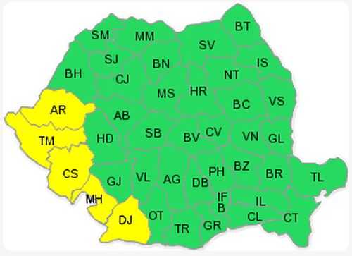 Judetele Timis, Caras-Severin, Arad, Mehedinti si Dolj se vor afla, in intervalul de sambata, ora 20.00 - luni, ora 10.00, sub cod galben de ploi, potrivit unei atentionari emise de Administratia Nationala de Meteorologie, scrie MEDIAFAX.