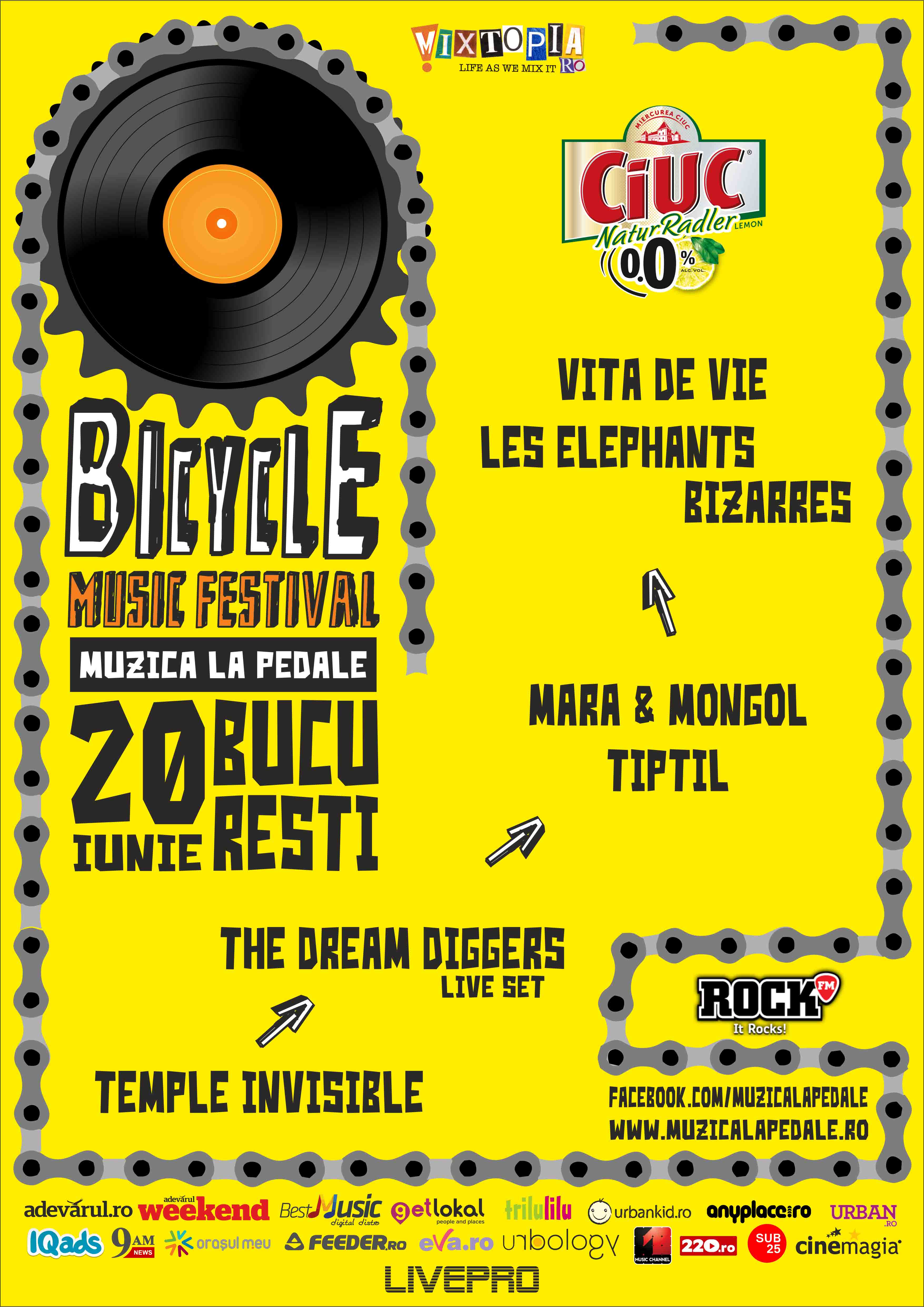Festivalul va avea loc in Bucuresti, sambata, 20 iunie, si va fi un eveniment alternativ, dedicat pasionatilor de biciclete si muzica. Trupele vor concerta pe patru scene diferite, de-a lungul traseului caravanei de biciclete Bicycle Music Festival.