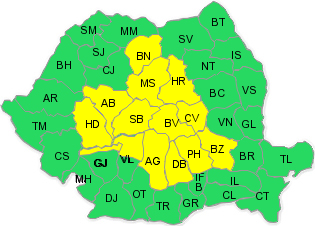 Avertizarea cod galben a fost emisa pentru judetele Buzau, Prahova, Dambovita, Arges, Hunedoara, Alba, Sibiu, Brasov, Covasna, Harghita, Mures, Bistrita-Nasaud si nordul judetelor Valcea si Gorj.