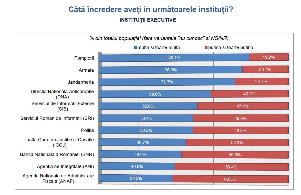 Primele trei pozitii ale topului increderii in institutiile executive sunt ocupate de Pompieri, Armata si Jandarmerie – cotele de incredere inregistrate fiind totodata si cele mai ridicate, per total -. Astfel, 80,1% dintre romani au incredere multa si foarte multa in Pompieri (fata de 77,5% in noiembrie 2015). Urmeaza Armata cu 76,3% (fata de 75,4% in noiembrie 2015) si Jandarmeria cu 72,3%, in crestere semnficativa fata de noiembrie 2015, cand 65,8% dintre romani declarau ca au incredere multa si foarte multa in aceasta institutie. 59,8% dintre romani au incredere multa si foarte multa in DNA (fata de 61,2% in septembrie).
