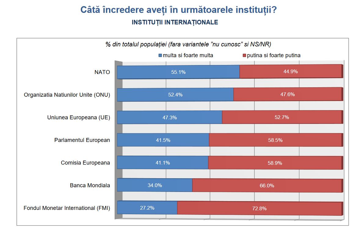 Pe primul loc in topul increderii in institutiile internationale se situeaza in continuare NATO, cu 55,1% incredere multa si foarte multa (fata de 55,7% in noiembrie 2015). 52,4% dintre respondenti au incredere multa si foarte multa in ONU (fata de 54,8% in noiembrie 2015), iar 47,3% in Uniunea Europeana (fata de 50,5% in noiembrie 2015).