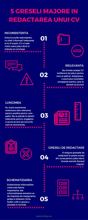 Iata un infografic in care sunt punctate principalele 5 greseli pe care candidatii le fac in redactarea CV-ului si pe care recruiterii nu vor sa le mai vada.