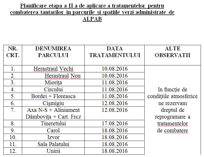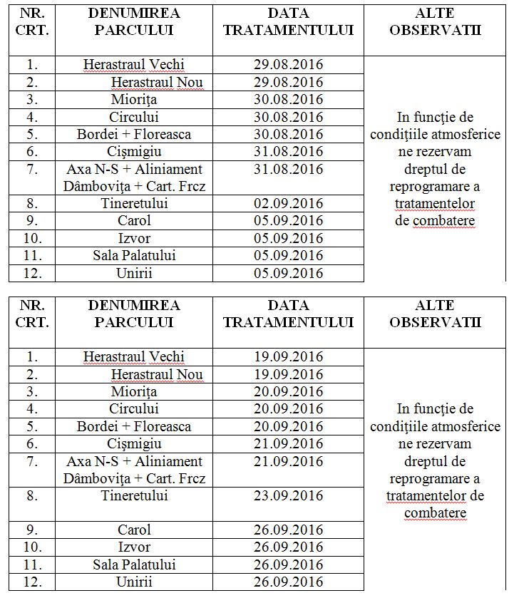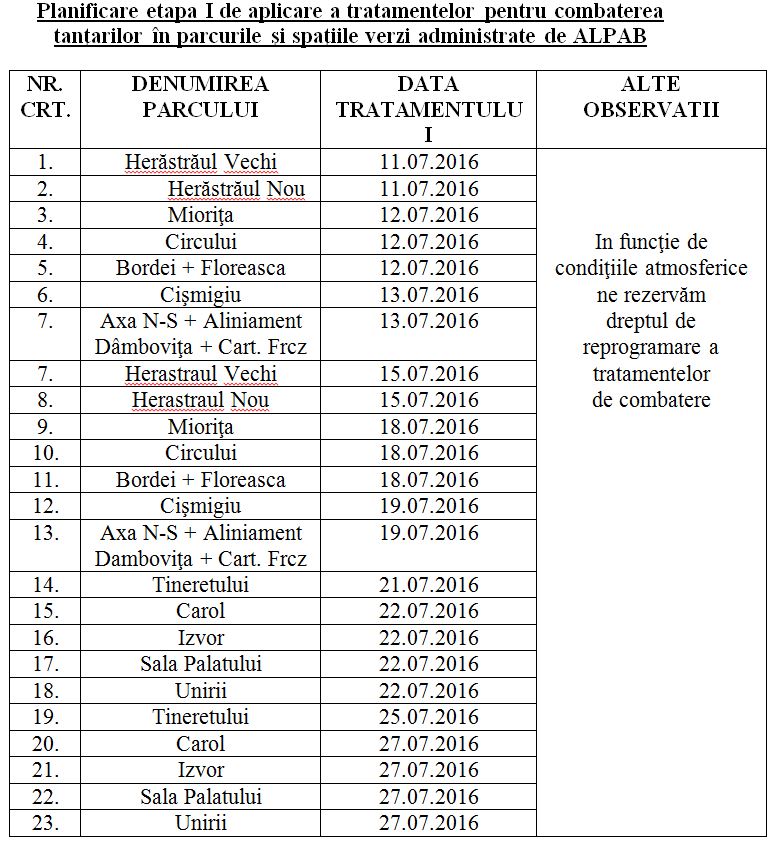 Tratamentele se vor face etapizat, dupa cum urmeaza: in etapa I se va aplica tratamentul de baza, care va fi repetat la un interval de aproximativ 3 zile, in perioada 11- 27 iulie, iar in etapa a II a se vor efectua trei tratamente succesive de combatere a tantarilor, din doua in doua saptamani de la aplicarea tratamentului de baza, in perioada 10 august- 29 septembrie, potrivit unui comunicat emis de Primaria Capitalei.