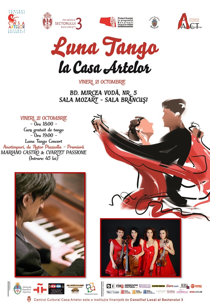 Muzica, dansul si conceptul de muzica live cu tango se reunesc intr-un amestec exuberant de pasiune, tehnica si armonie, timp de 3 vineri consecutive: 21 octombrie, 28 octombrie si 4 noiembrie a.c., la Centrul Cultural Casa Artelor (Mircea Voda nr. 5, sector 3), in cadrul spectacolului-eveniment “Luna Tango Concert”. “Luna Tango Concert” este un spectacol conceptual, mereu in schimbare ca si fazele lunii – artistii-dansatori sunt alesi prin vot online pe baza de inscriere, spectacolul fiind diferit de fiecare data si recreat sub ochii spectatorilor. Artistii de marca ce vor celebra conceptul Luna Tango sunt muzicianul argentinian Mariano Castro, dublu nominalizat la Premiile Latin Grammy, Omar Massa, ambasadorul muzicii Astor Piazzola alaturi de Placido Domingo, alaturi de Cvartetul Passione si Jezebel. Spectacolul este transmis in live-stream si se poate vedea de oriunde in lume.