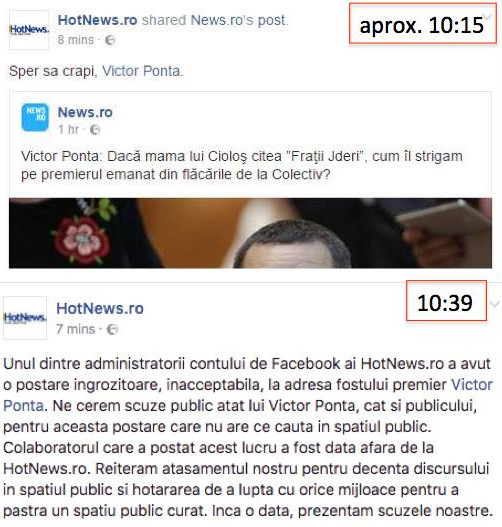„Sper sa crapi, Victor Ponta”, a scris respectivul angajat, pe pagina de Facebook a site-ului Hotnews. Postarea a stat mai bine de 15 minute online a disparut ulterior, iar redactorul-sef al HotNews, Cristi Pantazi, a prezentat scuze publice, mentionand ca angajatul a fost concediat, scrie paginademedia.ro.