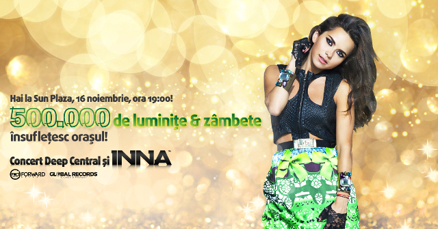 Miercuri, 16 noiembrie, de la ora 19.00, pe Esplanada Sud din Sun Plaza are loc evenimentul care deschide sezonul sarbatorilor de iarna, prin aprinderea luminitelor de Craciun. Inna este invitatul special - iar trupa The Pastels , din Slovacia, va sustine un spectacol inedit de dans cu led-uri si va aprinde instalatia de jumatate de milion de luminite.