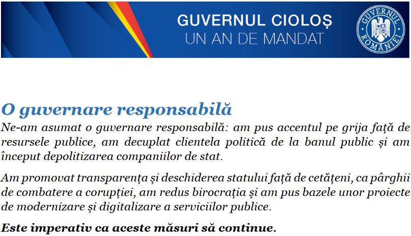"Obiectivul principal al acestui guvern a fost asigurarea stabilitatii politice si economice a tarii. Insa, inca de la preluarea acestui mandat exceptional, a fost evident ca societatea avea asteptari mult mai mari de la acest guvern independent politic. Asteptari legitime, firesti intr-o societate moderna, europeana: un guvern care nu minte, un guvern care nu este corupt, un guvern care nu adopta politici publice din ratiuni populiste, un guvern care lucreaza numai in interesul public.