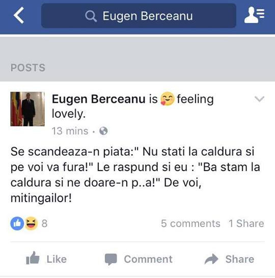 "Se scandează-n piață: 'Nu stați la căldură / Și pe voi vă fură!' Le răspund și eu: 'Ba stăm la căldură / Și ne doare-n p...ă!' De voi, mitingăilor!", este mesajul scris, joi seara, de catre consilierul Eugen Berceanu, pe pagina sa de Facebook.