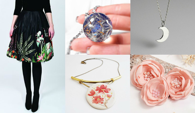 Fusta cu flori, Handmademylove | Pandantiv cu puf de papadie, EmilyRay | Pandantiv semiluna, Brielle Bijoux | Pandantiv ceramica pictata, GloryBox | Flori textile, Dream Butterfly - Disponibile si online pe www.breslo.ro.