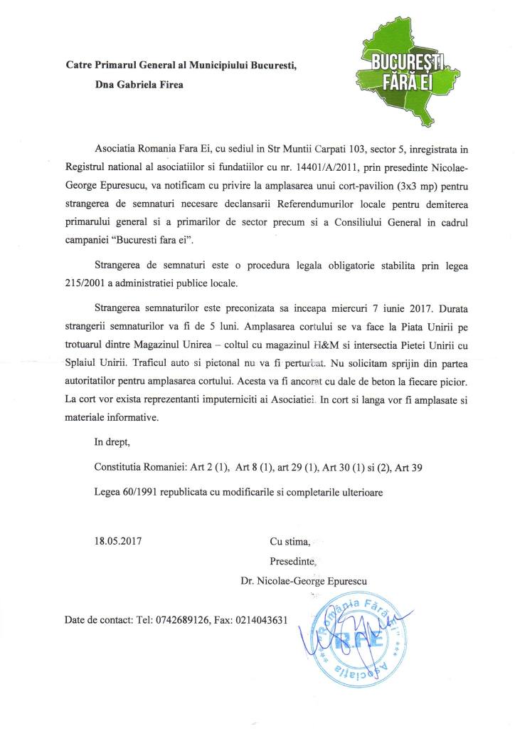 Iata notificarea trimisa de catre asociatia "Bucuresti fara ei" Primariei Capitalei