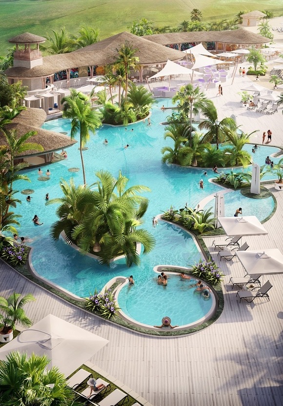 In zona dedicata relaxarii, The Palm, pe langa plaja generoasa cu nisip fin, vizitatorii se pot relaxa intr-o piscina de 720 metri patrati, cu o temperatura constanta de 30 de grade Celsius si o adancime de 1,26 de metri, a carei capacitate este similara piscinei interiorare din zona The Palm. Piscina cu pool bar, situata in zona de sud a zonei The Palm, dispune de 171 de locuri de relaxare - locuri la bar, locuri la mese, pe bancheta si sezlonguri in apa - si este inconjurata de vegetatie exotica, palmieri cu inaltime de pana la 7 metri si gradene cu sezlonguri.