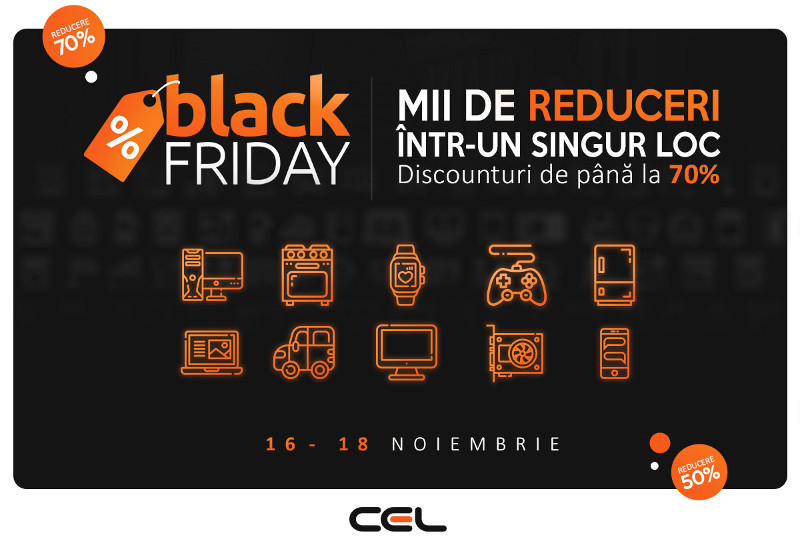 Black Friday la CEL.ro aduce reduceri considerabile la categoria de electrocasnice, unde se pot gasi reduceri de pana la 40% la combine frigorifice si aspiratoare, 1750 discount la espressoare, iar pentru categoria de televizoare, reducerile pot ajunge pana la 1600 lei . Pentru laptopuri, magazinul a pregatit reduceri ce pot ajunge pană la 40% pentru produsele din gama Asus.