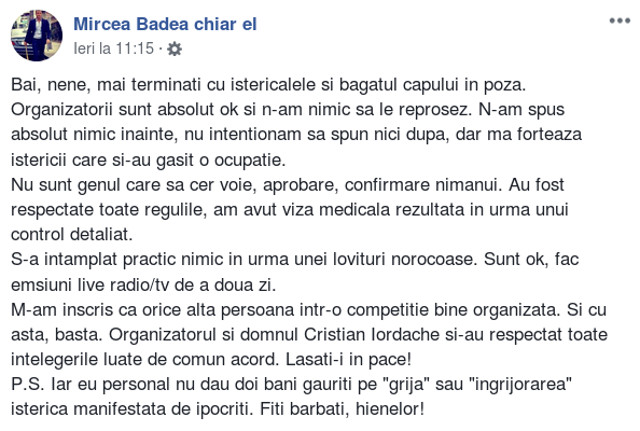 "Bai, nene, mai terminati cu istericalele si bagatul capului in poza. Organizatorii sunt absolut OK si n-am nimic sa le reprosez. N-am spus absolut nimic inainte, nu intentionam sa spun nici dupa, dar ma forteaza istericii care si-au gasit o ocupatie. Nu sunt genul care sa cer voie, aprobare, confirmare nimanui. Au fost respectate toate regulile, am avut viza medicala rezultata in urma unui control detaliat. S-a intamplat practic nimic in urma unei lovituri norocoase. Sunt OK, fac emisiuni live radio/tv de a doua zi. M-am inscris ca orice alta persoana intr-o competitie bine organizata. Si cu asta, basta. Organizatorul si domnul Cristian Iordache si-au respectat toate intelegerile luate de comun acord. Lasati-i in pace! P.S. Iar eu personal nu dau doi bani gauriti pe «grija» sau «ingrijorarea» isterica manifestata de ipocriti. Fiti barbati, hienelor!", a scris Mircea Badea pe Facebook, potrivit adevarul.ro.